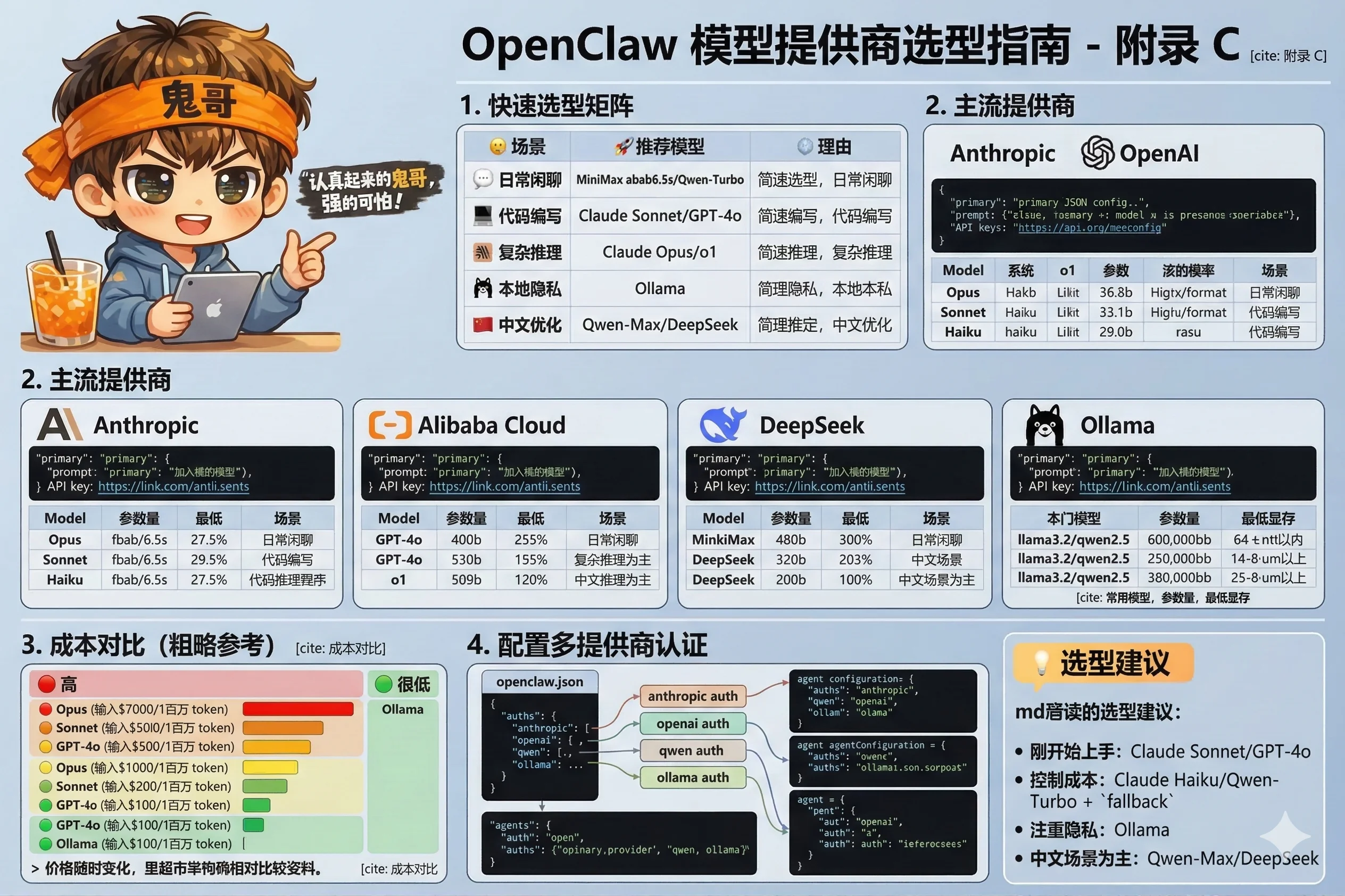 OpenClaw 支持通过统一的 provider/model-id 格式对接多家模型提供商。本附录帮你在成本、能力、速度之间找到适合自己场景的组合。