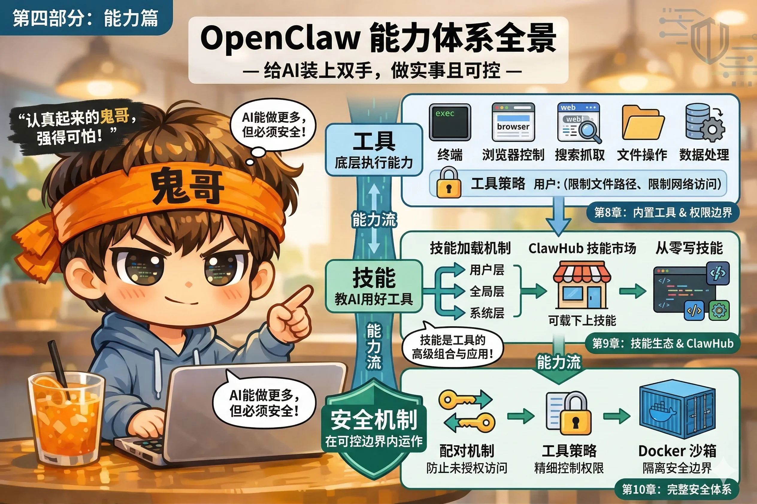 前三部分解决的是"AI 是谁、它记得什么、它的对话怎么管理"。这一部分解决更实际的问题:AI 能帮你做什么,以及怎么确保它不会做坏事。