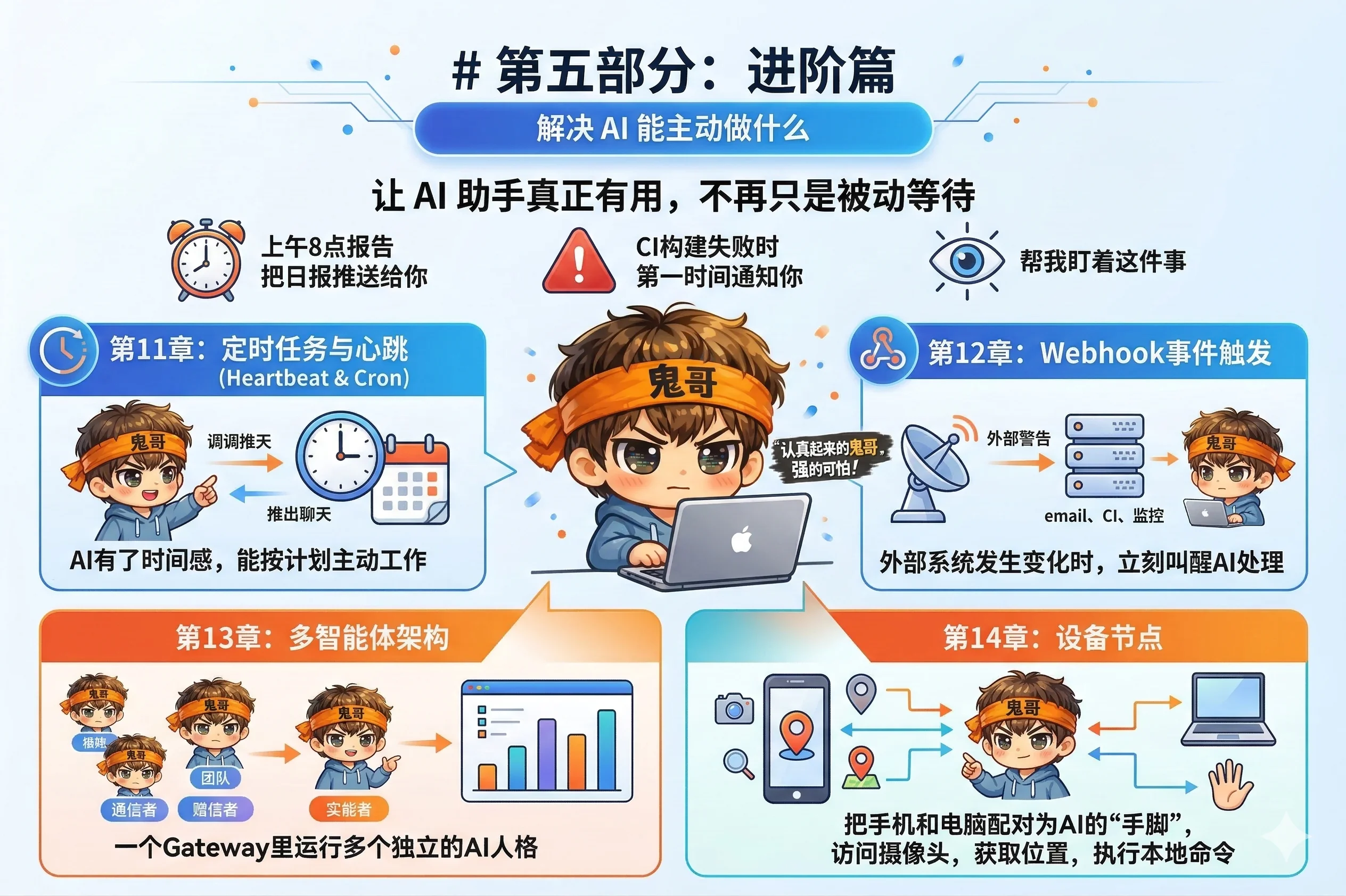 这一部分的四章,覆盖了 OpenClaw 最能体现"主动性"的能力: