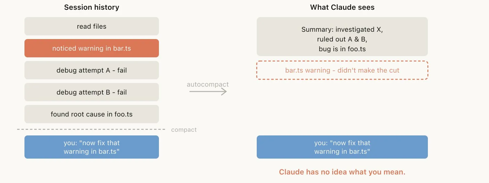 举个例子:autocompact 在一段漫长的 debugging session 之后触发,它把调查过程总结了一遍。然后你的下一条消息是"现在去修 bar.ts 里那个 warning。"