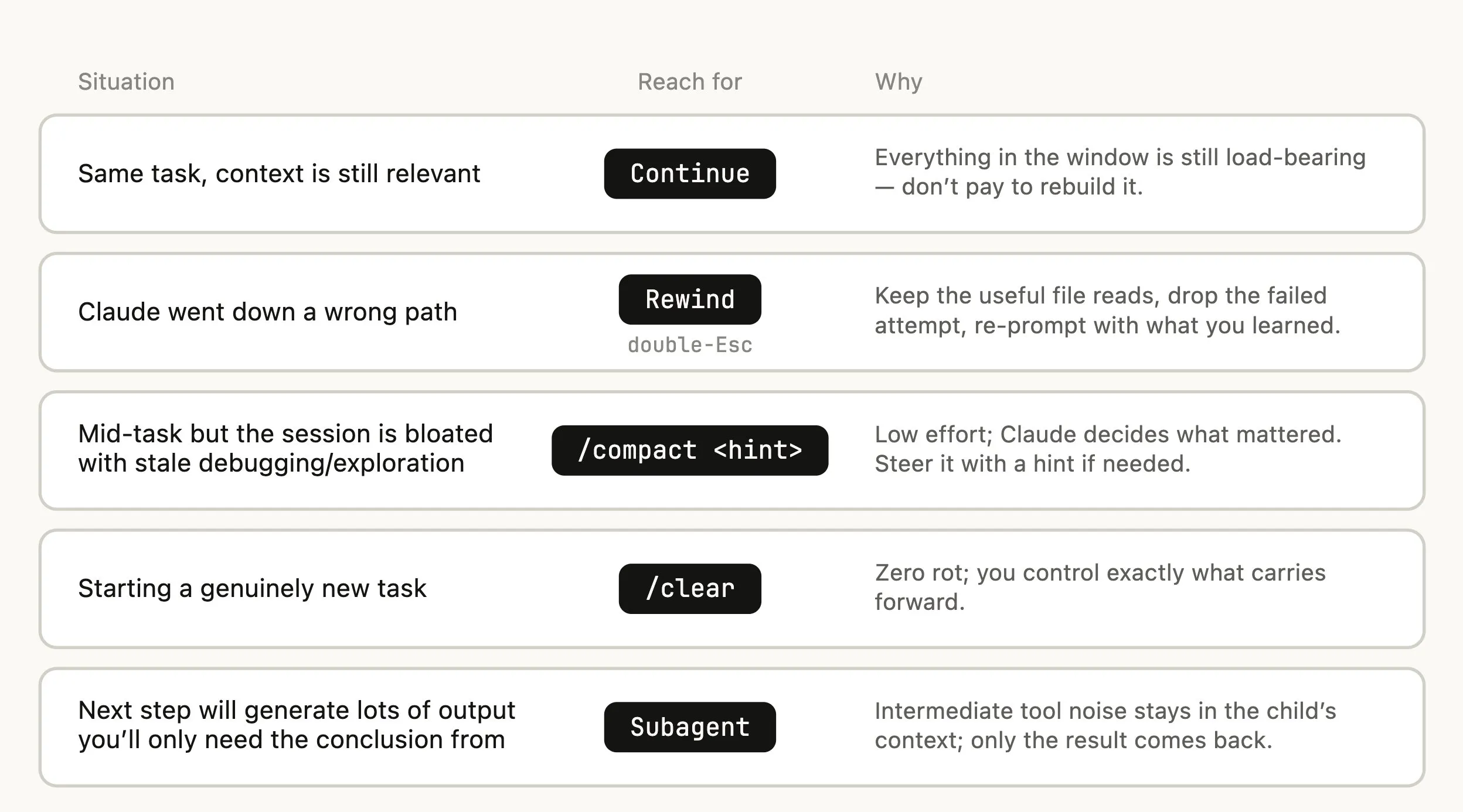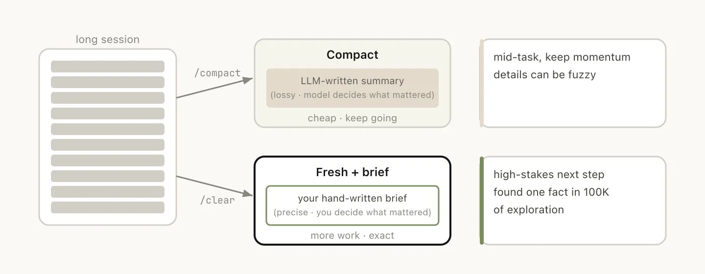 /clear:你自己写下重要的内容——“我们正在重构 auth 中间件,约束是 X,关键文件是 A 和 B,已经排除了方案 Y”——然后清空重开。工作量更大,但最终的上下文完全是你认为相关的内容。