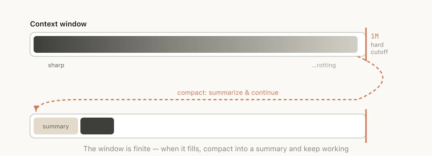 解法:利用 1M 上下文给你的时间余量,在 Context Rot 出现之前主动执行 /compact,并且告诉它你接下来打算做什么,作为总结的方向引导。