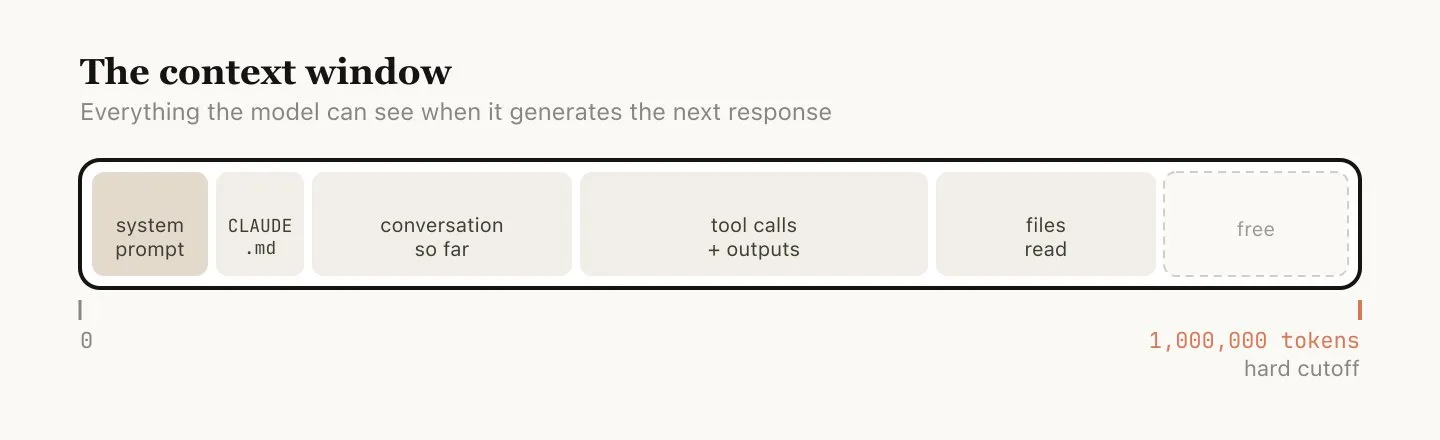 Context Window(上下文窗口) 是模型在生成下一条回复时能「看到」的全部内容——包括系统提示词、整段对话历史、每次工具调用的输入和输出、以及读过的每一个文件。Claude Code 的上下文窗口是 100 万 token。