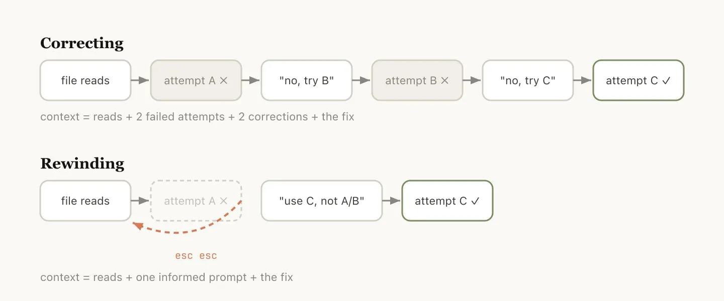 Rewind 往往比纠正更好。 举个例子:Claude 读了 5 个文件,尝试了一个方案,没成功。你的本能反应可能是说"那个不行,试试 X 方案吧"。但更好的做法是:rewind 到刚读完文件的那个点,然后带着你学到的信息重新给指令。