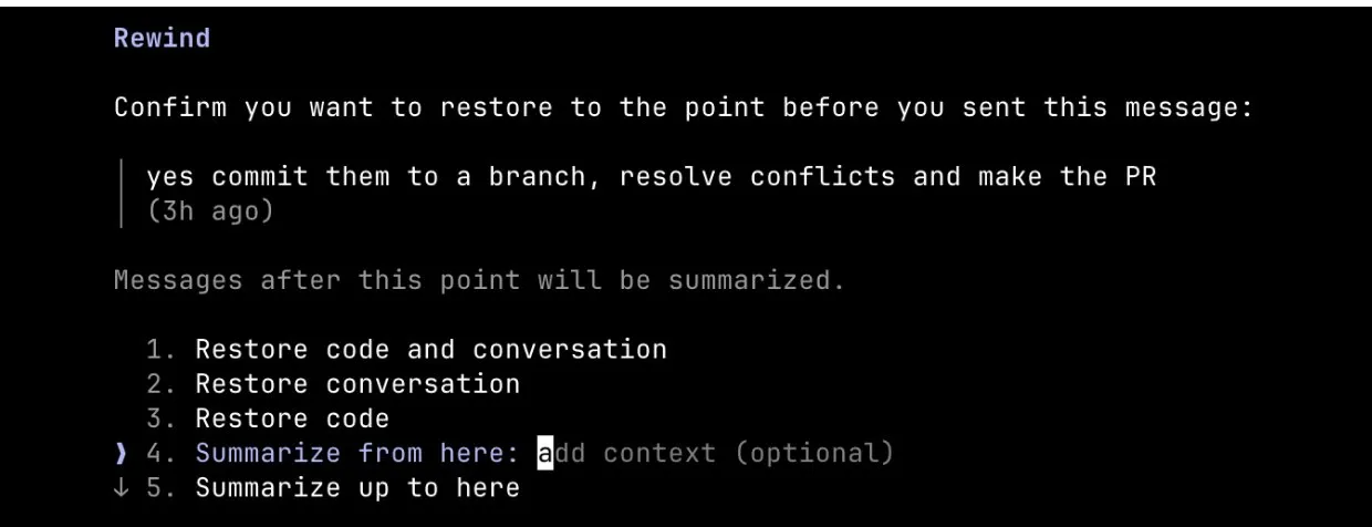 你还可以用"summarize from here"让 Claude 总结它的发现,生成一份交接消息——有点像未来的 Claude 给过去的自己写了一封信:这条路走不通,原因是什么。