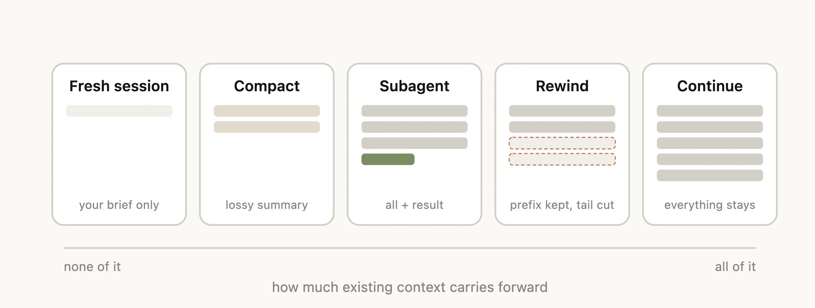 假设你刚让 Claude 做完了一件事,上下文里现在有了一些东西(工具调用、输出结果、你的指令),接下来你有 5 个选项——但大多数人只用了第一个: