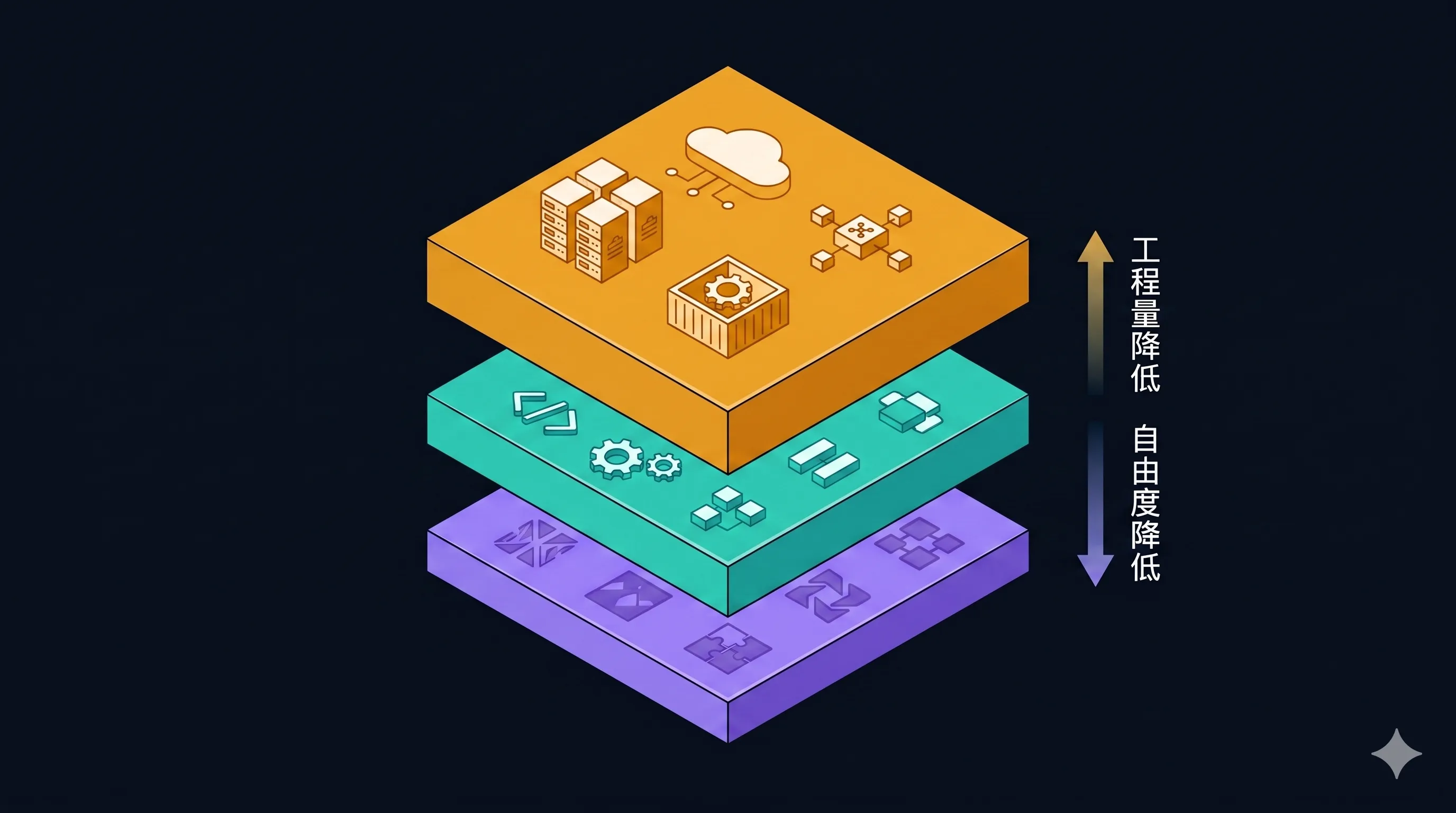 从左到右是"自由度递减、工程量递减"的关系。 哪一层适合你,取决于你要做的系统规模和运行需求。
