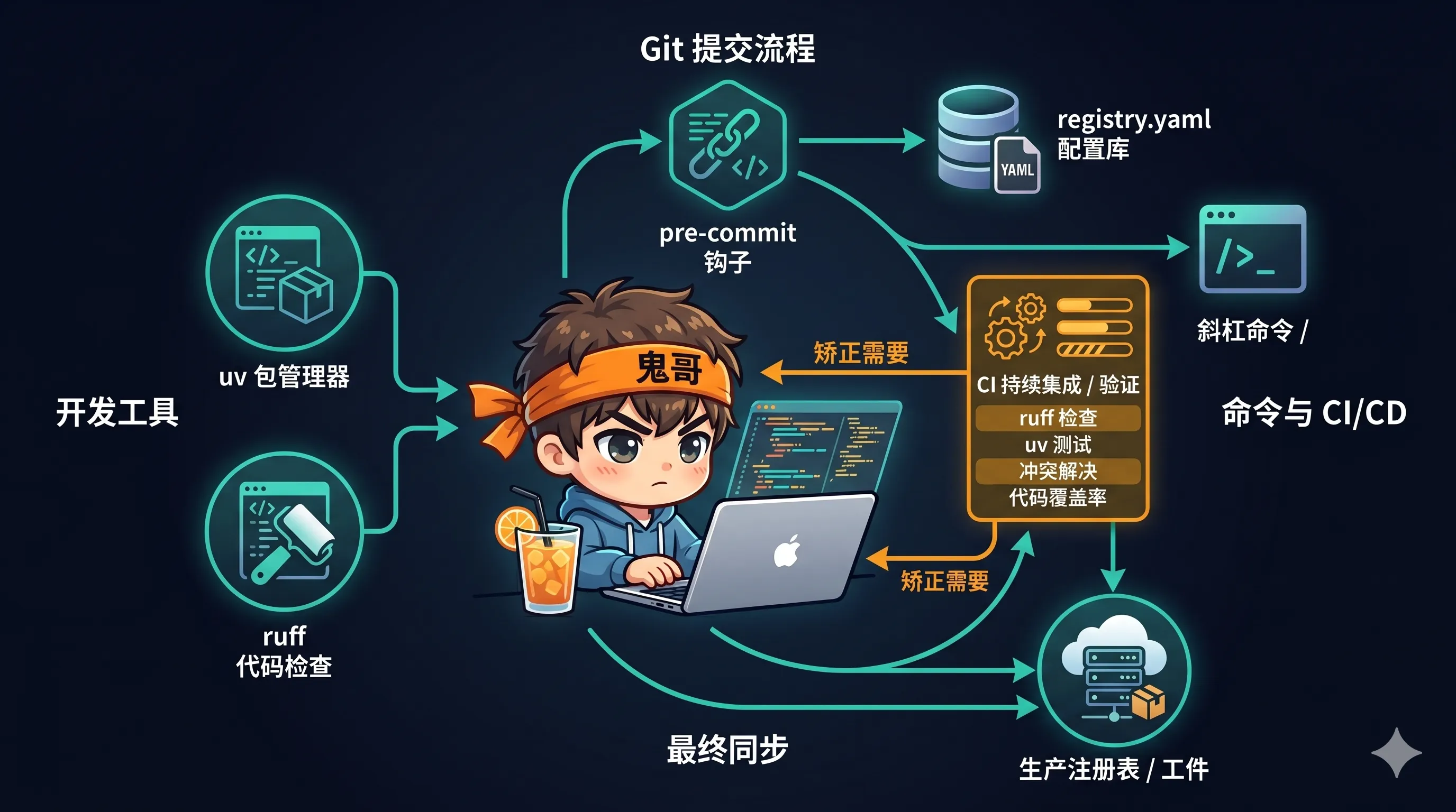 | 工程实践(meta) | 整个仓库的组织方式 | uv / ruff / registry / slash commands |
