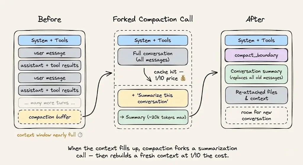 对于上下文压缩(当你快接近上下文上限时),要用**“缓存安全的分叉”这种做法:保留同样的 system prompt、tool、对话历史,然后把压缩指令作为一条新消息追加**在后面。缓存前缀得以复用,真正要被计费的新 token 只有压缩指令本身。
