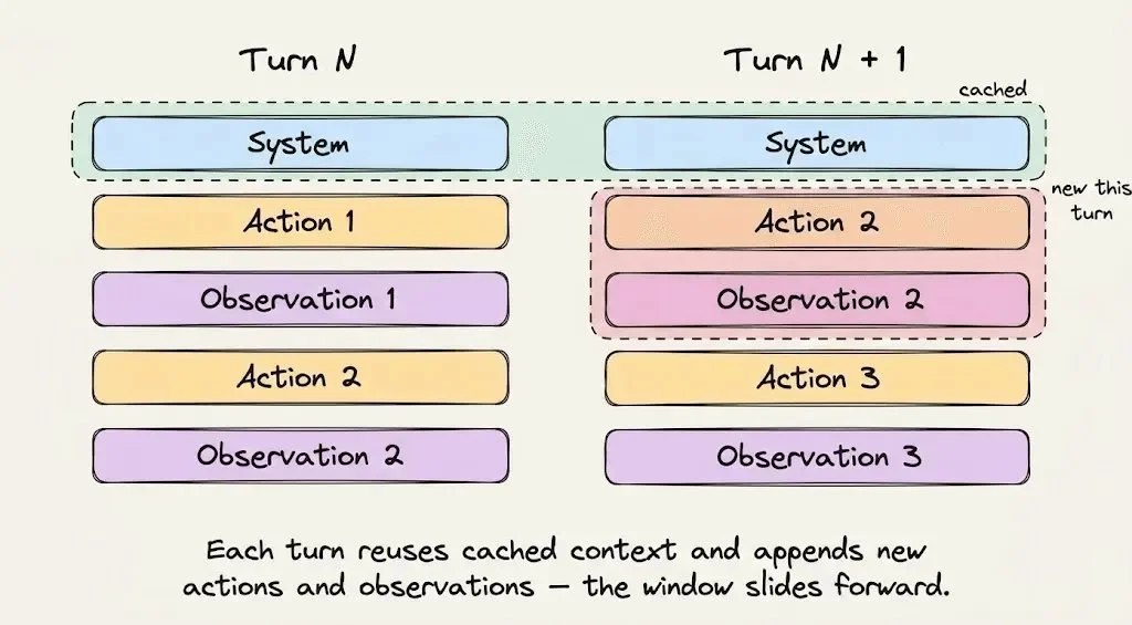 | 动态后缀 | 用户消息、模型回复、tool 输出、终端观察 | 每轮都在增长 |