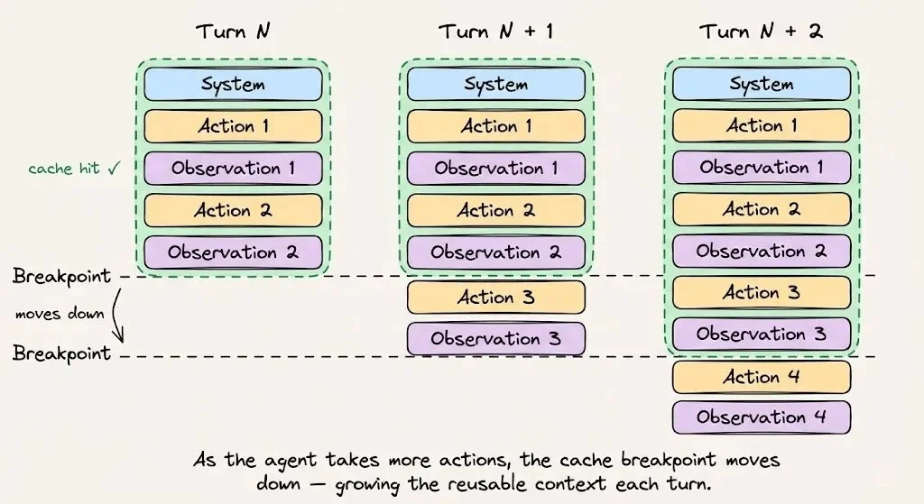 如果你用的是 Anthropic API 的 auto-caching,缓存断点会随着对话增长自动推进。如果不用 auto-caching,你得手动管理 token 边界——边界错了一个位置,就意味着完全错过缓存。