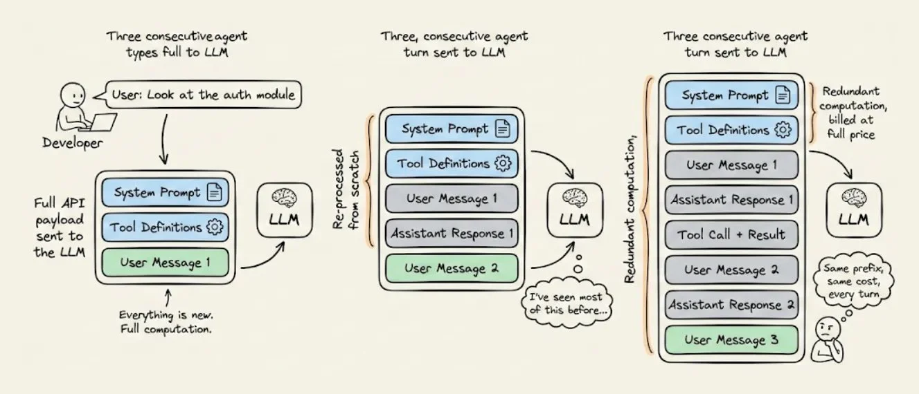 这不是 bug,是 LLM API 的工作方式。对于长会话的 Agent 来说,这种"重复计算"往往是你 AI 基础设施账单里最贵的一项。