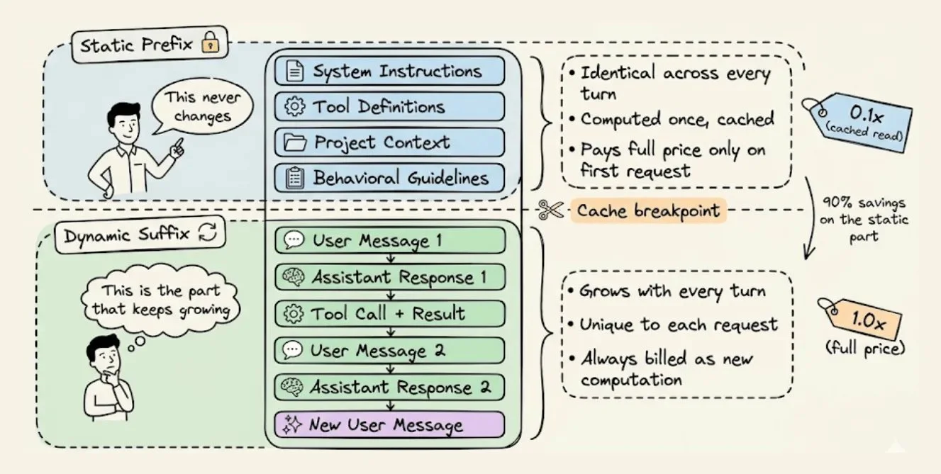 核心思想其实简单到一句话:把静态内容放最上面,动态内容从下面长。 基础设施会对前缀做哈希、存储 KV tensor、然后在你每一次读取时给你九折。